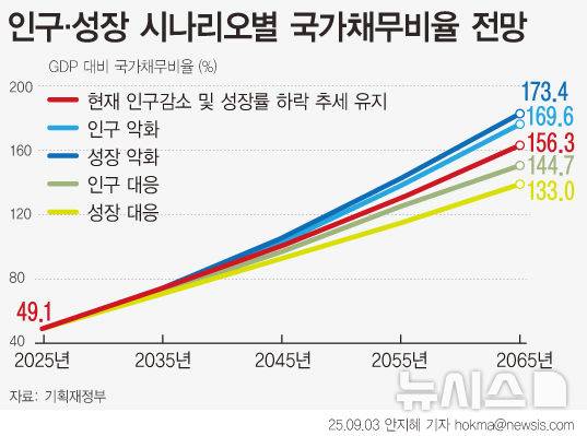 [서울=뉴시스] 기획재정부가 3일 국회에 제출한 ‘제3차 장기재정전망’에 따르면, 저출생과 고령화, 성장률 하락이 지속될 경우 우리나라의 GDP 대비 국가채무 비율은 2025년 49.1%에서 2065년 156.3%로 급등할 것으로 전망됐다. 이는 국회 예산정책처(2072년 173.0%)와 한국개발연구원(KDI·2060년 144.8%)의 장기재정 전망과 유사한 수치다. (그래픽=안지혜 기자) hokma@newsis.com