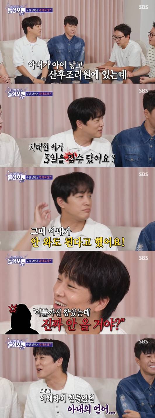 이런 차태현에 그의 아내는 화가 나고 말았다고. 그는 "이틀까진 참았는데 넌 안 올 셈이냐, 진짜 안 오냐고"라며 당시 상황을 전했고, 이어 '그냥 오지 말래서 안 와도 되나보다'라고 생각했다고 밝혔다.
