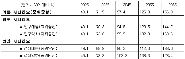 기준 시나리오에서, 실질적 재정 상태를 보여주는 GDP 대비 관리재정수지 적자는 올해 4.2%에서 2065년 5.9%로 상승한다. 총수입에서 총지출을 뺀 통합재정수지 적자는 같은 기간 GDP 대비 2.3%에서 10.6%로 크게 높아진다.