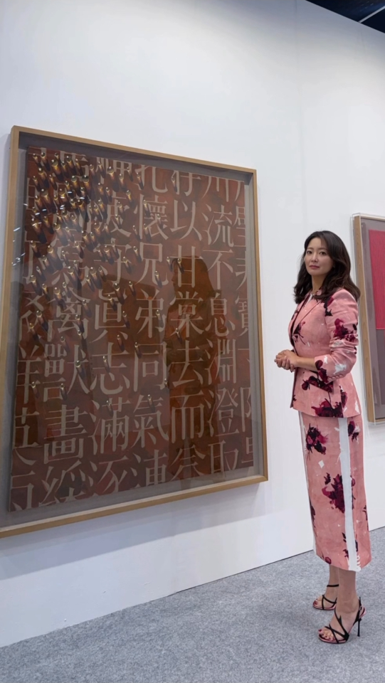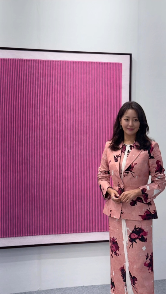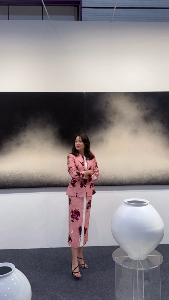그는 분홍빛 장미 패턴이 가득한 슈트를 입고 작품 앞에 서 있어 마치 장미 정원에서 걸어 나온 듯한 분위기를 자아냈다. 섬세한 패턴과 세련된 하이힐은 고혹적인 매력을 한층 부각시켰다.