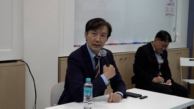조국 조국혁신당 혁신정책연구원장이 3일 대구 수성구 사회적협동조합 '지식과 세상'에서 기자들과 만나 서울대법대 동기인 나경원 의원을 향해 "국민의 대표기관 자격이 없다"고 강하게 비판했다.