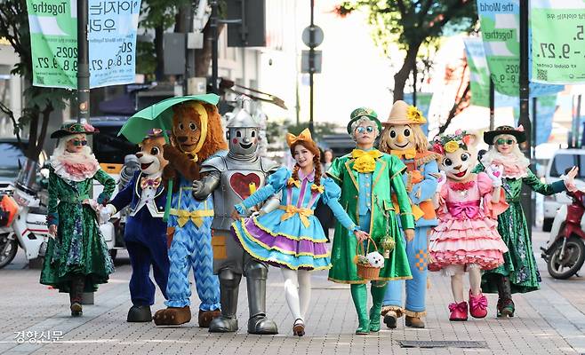 소설 <오즈의 마법사> 캐릭터로 분장한 에버랜드 연기자들이 3일 서울 중구 명동에서 퍼레이드를 펼치고 있다. 삼성물산 에버랜드는 5일부터 가을축제 ‘에버랜드 오브 오즈’를 개최한다.