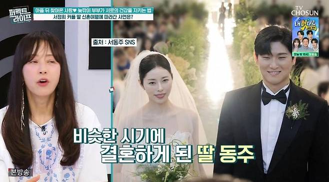 이어 서정희는 딸 서동주의 신혼여행에 동행하게 된 이유를 전했다. 그는 "사람들이 민폐 아니냐고 하더라"며 "원래 사돈까지 가려고 했는데 사정상 못 갔다, 나도 고민하던 중 사위랑 동주가 계속 같이가자고 해서 함께하게 됐다"고 설명했다. 서정희는 사위에 대해 "체격이 좋아서 딸을 잘 보호해 줄 것 같고 성격도 나이스하다"라고 애정을 드러냈다.