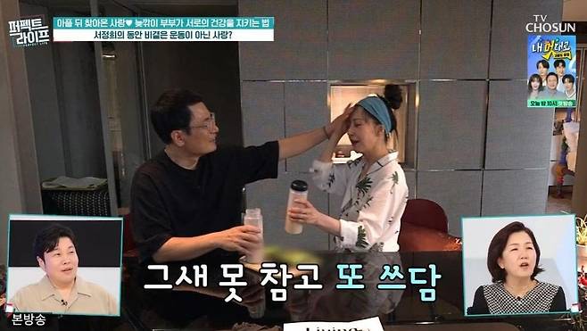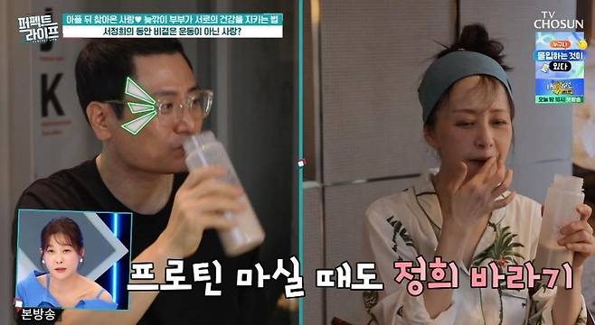 서정희는 집에서 홈트레이닝을 했고, 운동 후 남편은 프로틴을 챙겨줬다. 남편은 프로틴을 마실 때조차 아내 서정희에게 눈을 떼지 못했다.