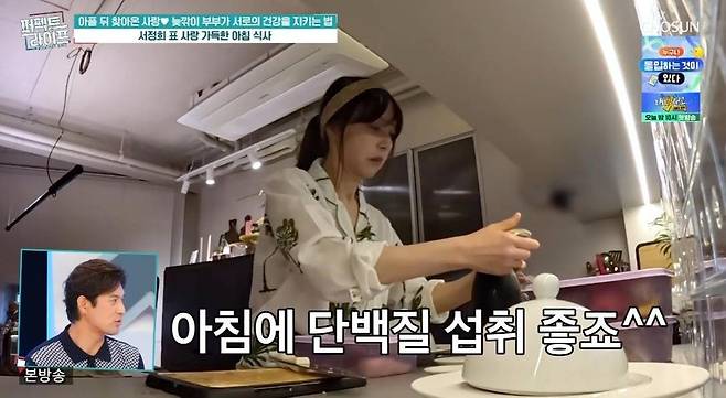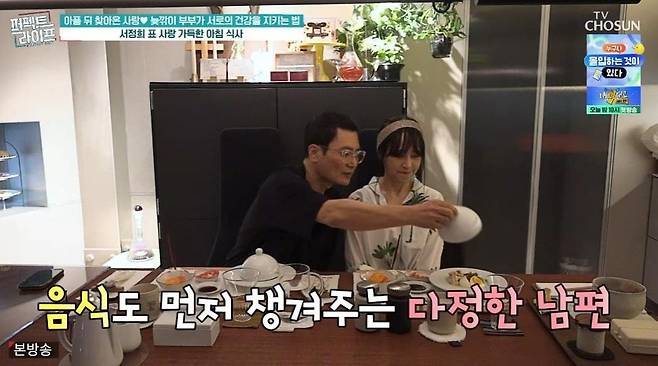 부엌에서 서정희는 남편을 위한 채소찜, 닭가슴살구이, 검은콩두유로 건강한 아침 식단을 준비했다. 남편은 그런 서정희를 살뜰하게 챙기며 다정한 모습을 보였다.