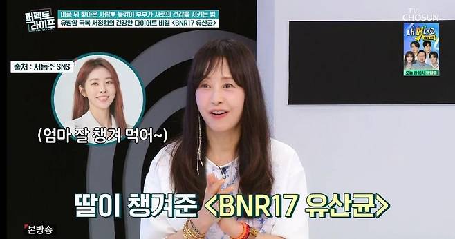 두 사람은 식사를 하기전 BNR 17유산균을 챙겨먹었다. 서정희는 "다이어트와 장 건강에 도움을 준다고 해서 저희 딸 서동주가 챙겨줬다"라고 자랑했다.