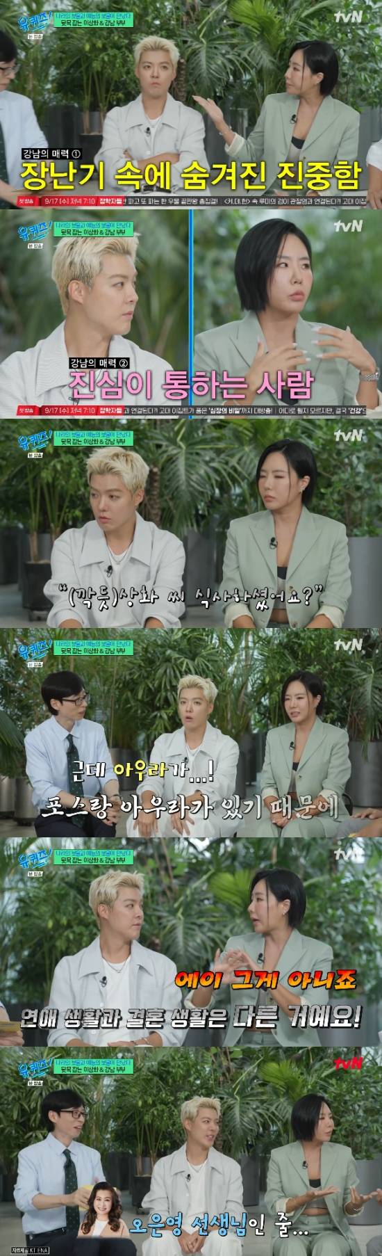 '유퀴즈'에서 강남이 아내인 이상화에게 끊임없이 극존칭을 쓰는 모습으로 웃음을 줬다.