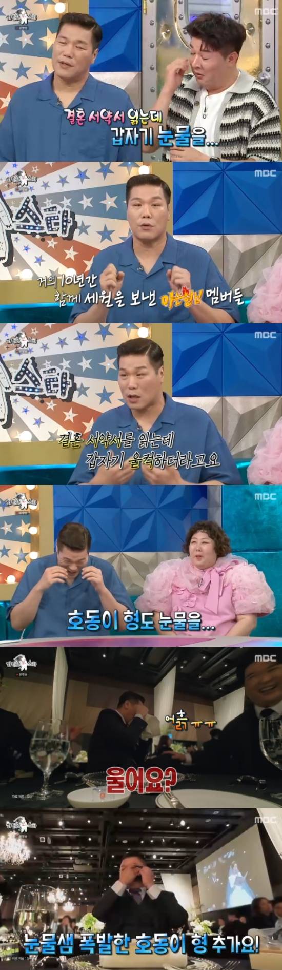 신동은 민경훈의 결혼식에 참석했을 때를 떠올리면서 "경훈이 형이 결혼식에서 결혼 서약서 읽는데 울더라"고 했고, 서장훈은 "'아는형님'을 10년을 함께 했다. 결혼식을 보는데 너무 대견하더라. 서약서를 읽는데 울컥했다. 그리고 옆을 보니 호동이 형도 울고 있었다"고 말해 웃음을 줬다.