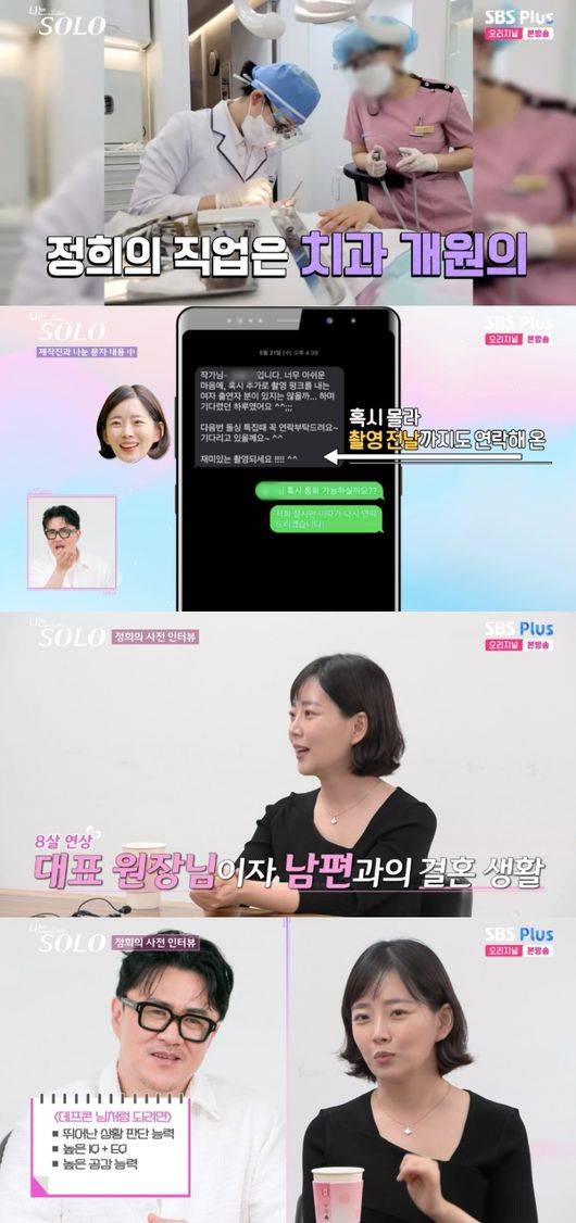 이어진 인터뷰에서 정희는 전 남편과 만남에 대해 “남편 병원에 제가 취직을 했다. 제가 사회 생활 경험이 없어서 인턴 레지던트 끝나고 바로 취직했다. 대표원장님이 고백하니까 얼레벌레 하다가 사귀고 결혼하게 됐다”라고 회상했다