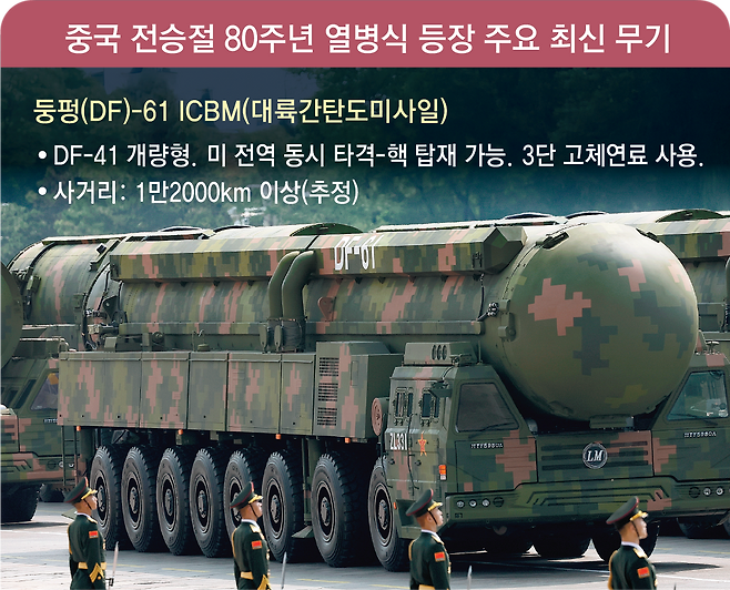 3일 중국 베이징 톈안먼(天安門) 광장에서 진행된 중국 전승절 80주년 열병식에서 차세대 대륙간탄도미사일(ICBM)과 극초음속미사일 등 미 본토와 역내 미군 전력을 정조준한 ‘핵 3축 체계’를 비롯한 신형 전략무기들이 처음 공개됐다. 땅과 바다, 하늘뿐 아니라 우주를 무대로 한 최신예 전력들이 총출동하면서 역대급 무기 전시장을 방불케한 것. 군 관계자는 “미국은 물론이고 한국, 일본을 포함한 주변국에 중국의 가공할 핵 타격력 등 막강한 힘을 과시하는 동시에 미 주도의 안보질서에 정면으로 도전장을 낸 것으로 풀이된다”고 했다.