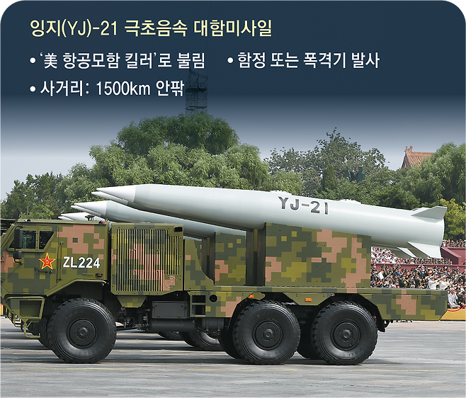 ‘괌 킬러’로 불리는 DF-26D도 이목을 집중시켰다. 기존 DF-26보다 정밀타격 능력이 개선됐고, 최대 사거리가 5000km로 중국 본토에서 미 전략자산의 핵심 거점인 괌을 직접 때릴 수 있다. 주일미군과 필리핀 미군 기지는 물론이고 대만해협의 미 항공모함도 사정권에 포함된다. 미 외교안보 전문매체 내셔널인터레스트는 “DF-26D 때문에 대만 유사시 미 항공모함이 대만해협 1000km 밖에서 머물러야 할 것”이라고 우려한 바 있다.