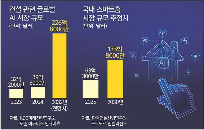 시장조사기관 포천 비즈니스 인사이츠와 KDB미래전략연구소에 따르면 기획, 설계, 시공 및 유지보수 등 업무 전반에 AI 기술을 활용한 글로벌 건설시장은 지난해 39억3000만달러(약 5조4000억원) 규모에서 2032년 226억8000만달러 수준까지 성장할 것으로 전망된다. 연구소는 “국내 건설산업에서의 AI 도입 확대는 공사비용 증가, 현장인력 부족 등의 문제를 해결하고 수익성을 제고해 건설업계에 새로운 기회가 될 것”이라고 짚었다.