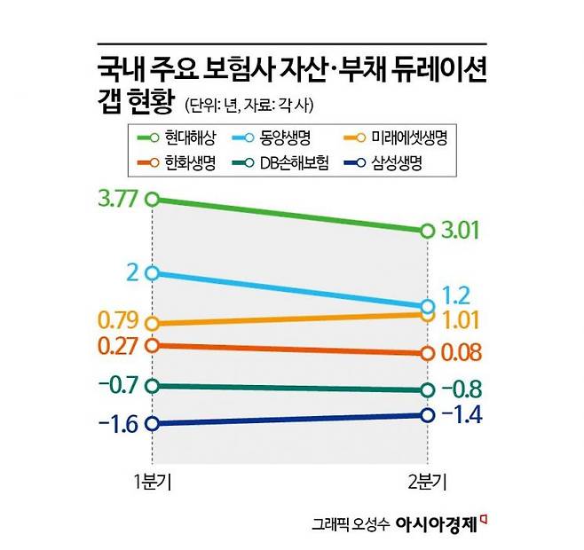 최근 보험사들은 ALM 관리에 적극 나서고 있다. 올해 1분기 삼성생명의 듀레이션 갭은 -1.6년이었지만 2분기엔 -1.4년으로 줄었다. 한화생명의 1분기 듀레이션 갭은 0.27년에서 2분기 0.08년으로 감소했다. 같은 기간 동양생명(2년→1.2년)·미래에셋생명(0.79년→1.01년)·현대해상(3.77년→3.01년) 등도 갭을 줄였다. DB손해보험은 1분기 -0.7년에서 2분기 -0.8년으로 갭이 소폭 확대됐다.