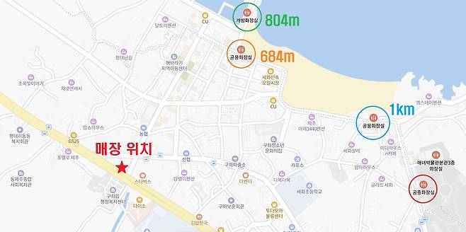 지도를 살펴봐도 이 매장에서 가까운 공용화장실은 최소 700~800m는 걸어가야 이용할 수 있습니다.