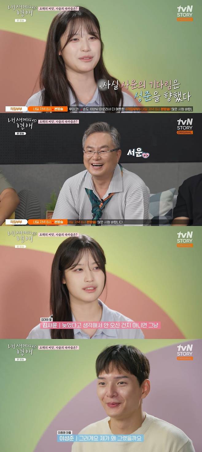 선준과 데이트를 나가게 된 사윤은 "사실 문자 보자마자는 성준 님이 와주시면 좋겠다고 생각을 했다"라며 아쉬움을 드러냈고, 이를 본 아빠 김대희는 "안 서방이 왜!"라고 버럭하며 안유성 눈치를 봐 웃음을 안겼다.