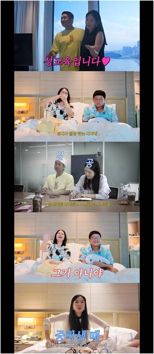 장영란은 "우리 지우 졸업 여행을 왔잖아. 지우를 위한 선물로 성교육입니다"라고 말했다.