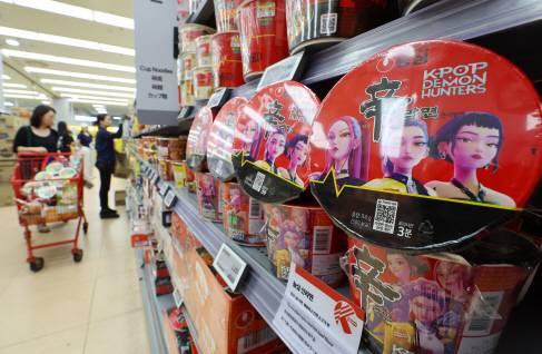 [서울 시내 한 마트에 농심과 넷플릭스가 협업한 '케이팝 데몬 헌터스' 스페셜 제품이 진열돼 있다. (사진=연합뉴스)]