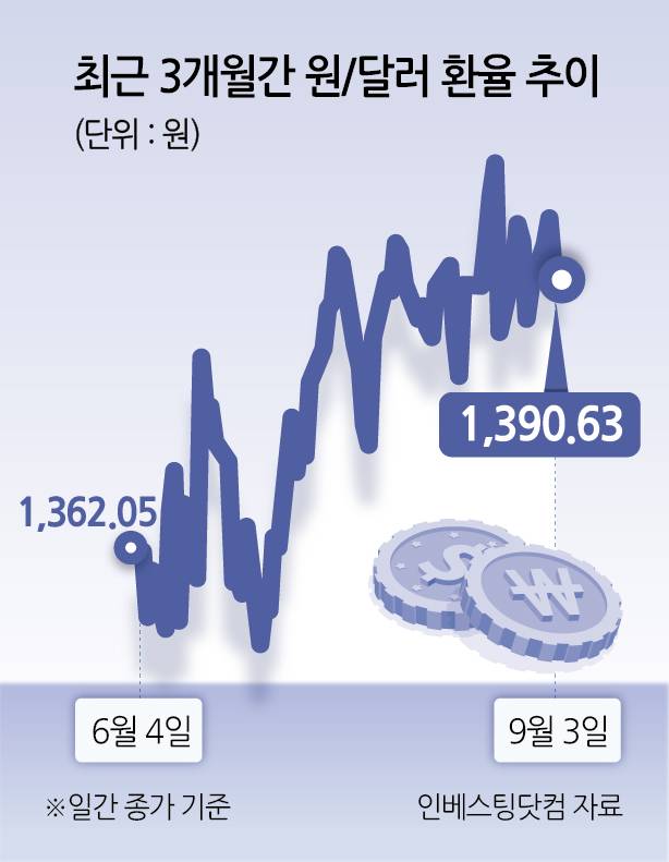 [헤럴드경제=신동윤 기자] 최근 미국 관세 정책 불확실성 심화와 주요국 재정 위기 등으로 인한 안전자산 선호 현상이 달러화 가치를 끌어올리는 형국이다. 이에 원/달러 환율도 ‘심리적 저항선’으로 불리는 1400원 선에 육박하는 모양새다. 고환율에 따른 환차손 우려가 ‘박스피(박스권에 갇힌 코스피)’ 현상 주요 요인으로 꼽히는 외국인 투자자의 ‘코리아 엑소더스(한국 증시 탈출)’를 부추겼단 분석도 나온다. 고환율 현상이 지속될 경우 ‘계절적 약세장’인 9월 외국인 투자자의 국내 증시에 대한 투심 약화 현상을 더 심화할 수 있단 우려도 제기된다.
