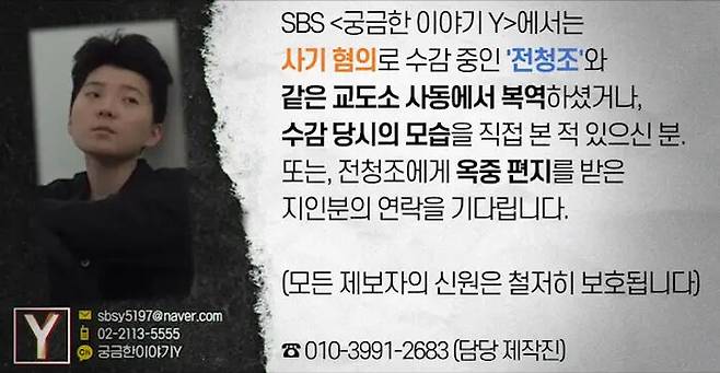 [SBS연예뉴스 ㅣ 강경윤 기자] SBS '궁금한 이야기 Y' 제작진이 사기 혐의로 수감 중인 전청조의 교도소 내 행태 의혹을 파악하기 위해 제보를 받기 시작했다.
