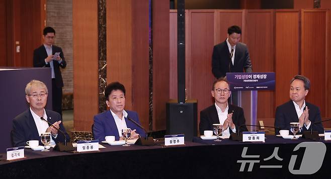 (서울=뉴스1) 김성진 기자 = 임종룡 우리금융지주 회장(왼쪽부터), 함영주 하나금융지주 회장, 양종희 KB금융지주 회장, 진옥동 신한금융지주 회장이 4일 오전 서울 중구 소공동 롯데호텔에서 열린 대한상의 기업성장포럼 출범식에 참석해 박수를 치고 있다. 2025.9.4/뉴스1