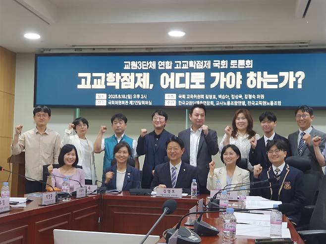 | ▲ 8.18 고교학점제 국회토론회 고교학점제, 어디로 가야 하는가?라는 교원3단체 연합 국회토론회에 국회교육위원회 위원장 김영호 의원과 백승아 의원(이상 더불어 민주당 의원), 정성국 국민의힘 의원, 강경숙 조국혁신당 의원, 박영환 전교조위원장, 이보미 교사노조위원장, 강주호 한국교총위원장, 발제 및 토론자, 방청객들이 참가하여 성황리에 진행됐다. 본 토론회에 앞서 주요 참석자들이 기념 촬영을 하였다. 사진 |