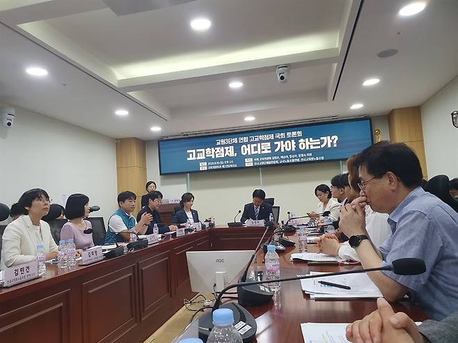 | ▲ 8.18 고교학점제 국회 토론회 8.18 교원 3단체 연합 "고교학점제, 어디로 가야 하는가?" 토론회에서 발제와 토론자들이 열띤 발표 및 토론을 하고 있다. 사진 |