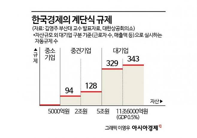 최 회장은 청중 앞에서 국내 기업 규제 343개가 적힌 대형 패널까지 공개해 눈길을 끌었다. 그는 "기업이 대기업 집단에 들어가면 규제가 늘어난다는 것 자체가 모순"이라고 비판했다. 대한상의와 김영주 부산대 교수 연구팀 조사에 따르면 경제 관련 12개 법안에만 기업별 차등규제가 343개 있었고, 중소기업에서 중견기업으로 가는 순간 94개 규제가 늘며 대기업이 되면 329개까지 급증했다. 경제형벌 조항은 6000여개에 달하는 것으로 나타났다.