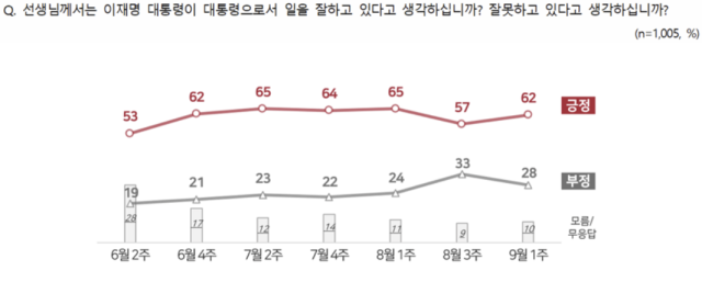 엠브레인퍼블릭·케이스탯리서치·코리아리서치·한국리서치가 지난 1∼3일 만 18세 이상 남녀 1005을 대상으로 진행해 이날 공개한 전국지표조사(NBS)에서 이 대통령의 국정운영을 ‘잘하고 있다’고 평가한 응답자는 62%로 집계됐다. 직전 조사(8월 18∼20일)보다 5%p 오른 것이다. 부정평가 응답도 직전보다 5%p 내린 28%를 기록했다.