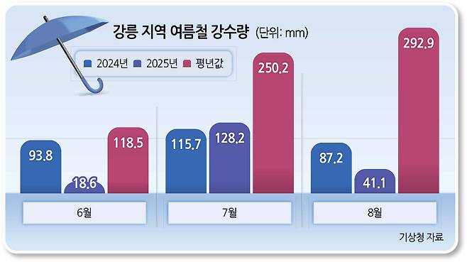 8월뿐 아니라 여름철 기준 강수량도 평년 대비 확 줄었다. 강릉시의 평년 월 강수량은 ▷6월 118.5㎜ ▷7월 250.2㎜ ▷8월 292.9㎜로 기록됐다. 반면 올해는 ▷6월 18.6㎜ ▷7월 128.2㎜ ▷8월 41.1㎜ 수준에 그쳤다.