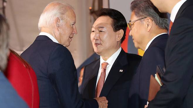 ▲ 2022년 9월 21일(현지시간) 윤석열 전 대통령과 조 바이든 당시 미국 대통령이 미국 뉴욕 한 빌딩에서 열린 글로벌펀드 제7차 재정공약회의를 마친 뒤 대화를 나누는 모습