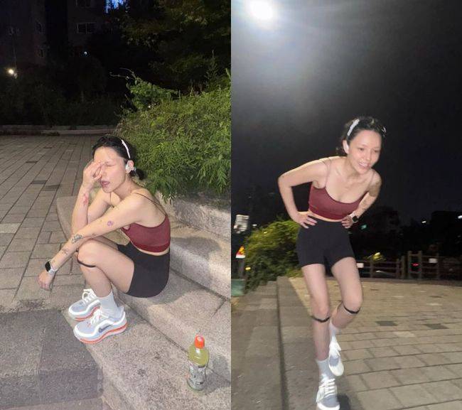 공개된 사진 속 지민은 민소매 크롭탑과 레깅스를 입고 야간 러닝을 즐기는 모습. 운동 중 잠시 휴식을 취하며 헐떡이는 얼굴을 드러내기도 했는데, 몰라보게 앙상해진 팔과 다리가 눈길을 끌었다.