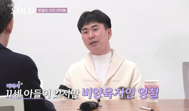 영철은 "10년 결혼생활 끝에 이혼해 11세 아들을 전처가 키우고 있다"고 비양육자임을 밝혔다. 이어 "연상이 좋고, 키가 크고 아이가 있는 여성을 원한다"고 자신만의 이상형을 밝혔다.