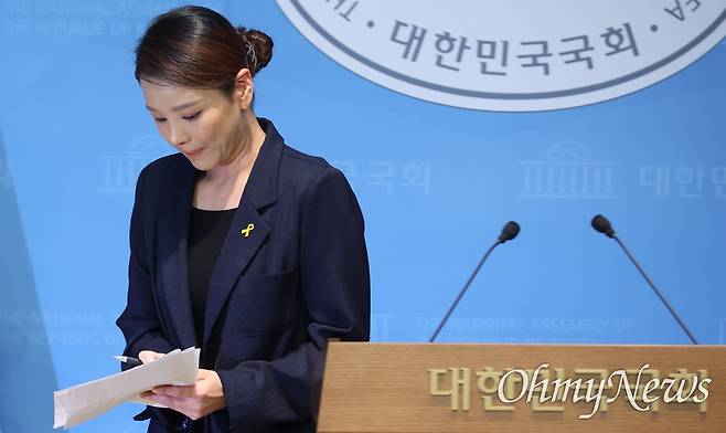 | ▲ 강미정 조국혁신당 대변인이 4일 오전 서울 여의도 국회 소통관에서 당내 성비위 고발 및 탈당 기자회견을 하고 있다. |