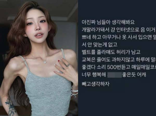 지난 3일 최준희는 자신의 인스타그램에 “생각해 봐요. 마른 몸이 돼서 인터넷으로 아무거나 옷 사서 입으면 안 맞는 게 없다”며 “벨트를 매도 허리가 남고 하루에 말라서 좋겠다는 소리 500번 듣는다”면서 다이어트를 독려했다. 그러면서 “매일매일 코르셋(을 착용한 것 같아) 너무 행복하다”고 말했다.