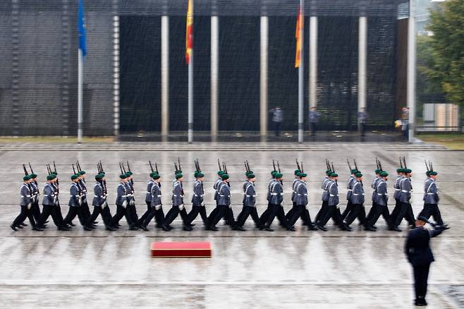 | ▲ 8월 28일(현지시간) 독일 베를린 국방부 앞을 독일 의장대 군인들이 지나가고 있다. |