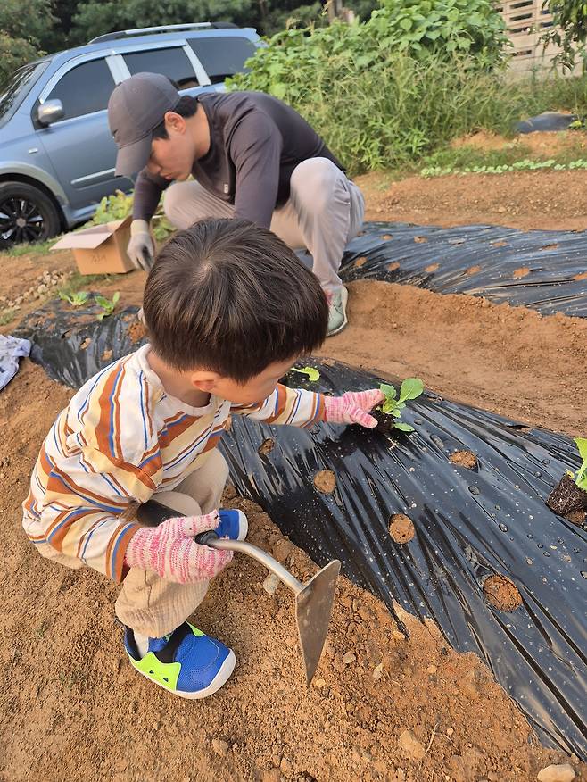 | ▲ 아빠와 함께 배추 모종을 심는 로리 작은 손길이 흙 속에 새로운 계절을 심고 있다. |