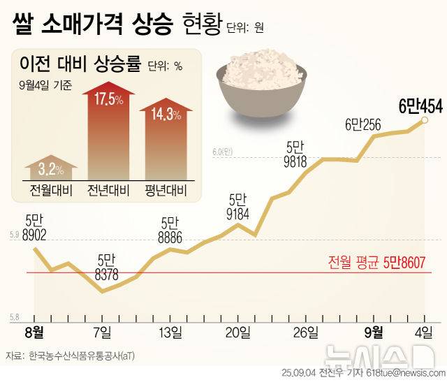 [서울=뉴시스] 4일 한국농수산식품유통공사(aT)에 따르면 전날(4일) 기준 쌀 20㎏ 소비자가격은 6만454원으로 집계됐다. 지난해 같은 시기보다 17.5%, 평년보다 14.3% 높은 수치다. 쌀값의 심리적 마지노선으로 여겨지는 20㎏ 당 6만원을 넘은 것이다. (그래픽=전진우 기자)