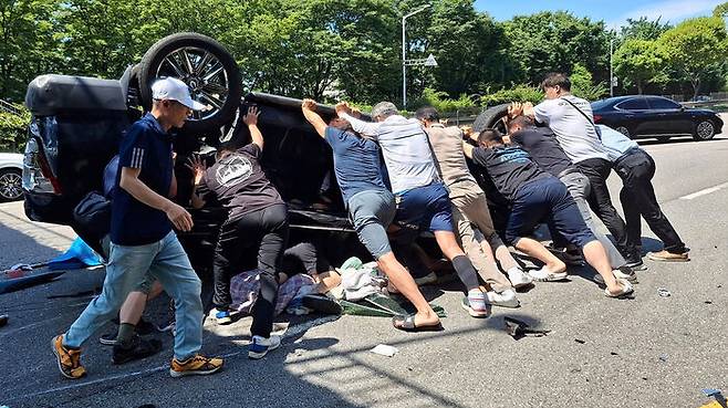 이어 다른 시민들과 힘을 모아 차량을 들어 올려 거꾸로 매달린 탑승자 4명이 빠져나오도록 도왔습니다.