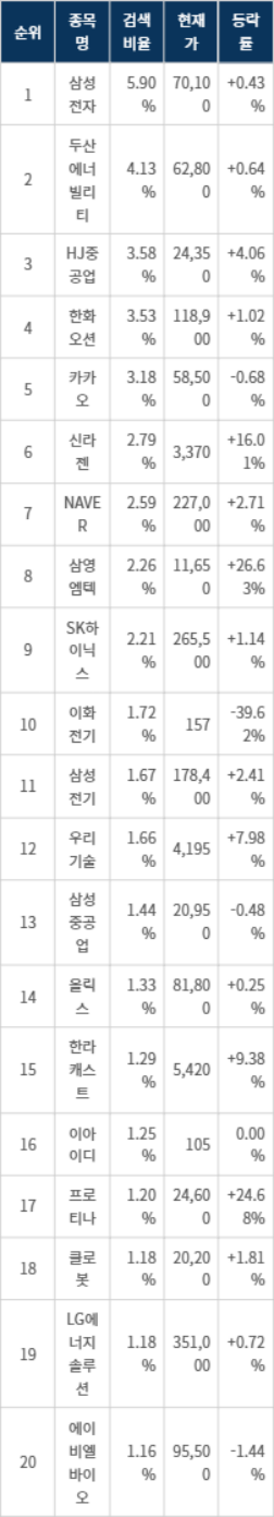 이어 검색비율 2위의 두산에너빌리티(034020)는 약보합세를 보이며 0.64% 상승 마감했다. 검색비율 3위의 HJ중공업(097230)은 4.06% 상승 마감했다. 검색비율 4위 한화오션(042660)은 1.02% 상승하며 강보합으로 마감했다. 검색비율 5위 카카오(035720)는 -0.68% 하락하며 약보합세로 마감했다.