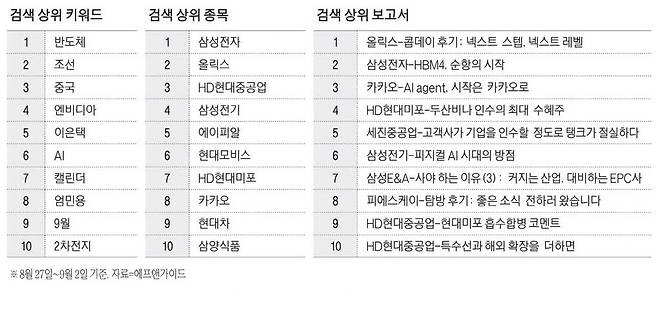 지난 일주일 동안 국내 투자자들의 최대 관심사는 반도체였다. 특히 HBM(고대역폭메모리) 빅테크 납품 가능성과 파운드리(반도체 위탁생산)에서 추가 수주 가능성을 두고 삼성전자 주가에 대한 관심이 높았다. 리포트 중에서는 제약기업 올릭스에 대한 리포트도 투자자들의 열독률이 높았다.금융정보업체 에프앤가이드에 따르면 8월 27일~9월 2일 투자자들이 가장 많이 검색한 키워드는 '반도체'(282회)였다. 그 뒤는 2위 '조선'(248회)이 바싹 붙어 이었다.