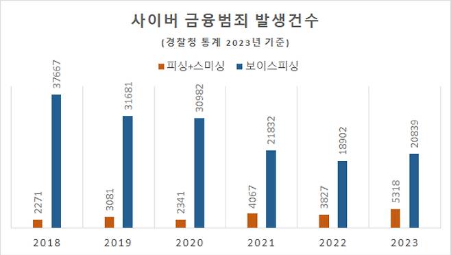 경찰청 통계에 따르면 보이스피싱 범죄 발생건수는 2018년 3만 7667건에서 2022년 1만 8902건까지 감소했지만 이듬해 2만 839건으로 늘어났고, 피싱과 스미싱은 2018년 2271건에서 2023년 5318건까지 증가했다.
