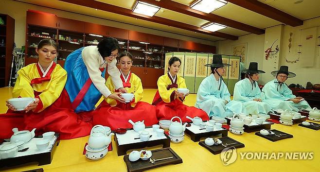 (인천=연합뉴스) 임순석 기자 = 4일 인천 연수구 가천대학교 메디컬캠퍼스 인수당에서 열린 외국인 의대 교환학생 '차(茶) 예절교육'에 참여한 외국인 학생들이 한복을 입고 차를 우려내고 있다. 2025.9.4