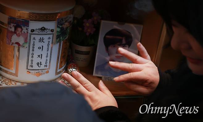 | ▲ 10.29이태원참사 희생자인 배우 고 이지한씨 유골함이 안치된 경기도 고양시 덕양구 한 추모공원에서 어머니 조미은씨가 아들 유골함과 사진이 들어 있는 유리를 어루만지고 있다. (2022년 12월 29일) |