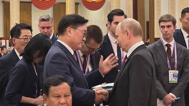 우 의장에 따르면 푸틴 대통령은 "국회의장께서는 남북 관계에 대해 어떻게 생각하는가"라고 물었고, 우 의장은 "한반도 평화를 잘 지켜내는 것이 세계 평화와 연결돼 있고 우리 국민의 안전과도 연결돼 있다"며 "푸틴 대통령도 한반도 평화를 만드는 데 관심을 가지면 좋겠다"고 답했습니다.
