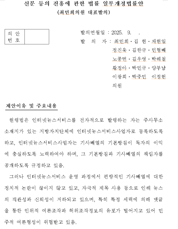 개정안을 대표 발의한 최민희 국회 과학기술정보방송통신위원회 위원장은 "포털의 편향적 기사 배열과 특정 세력에 의한 댓글 여론 조작이 민주적 여론 형성을 위협하고 있다"며 "이번 개정안을 통해 포털의 뉴스 편집 권한과 댓글 여론 조작을 원천적으로 차단할 것으로 기대한다"고 말했습니다.