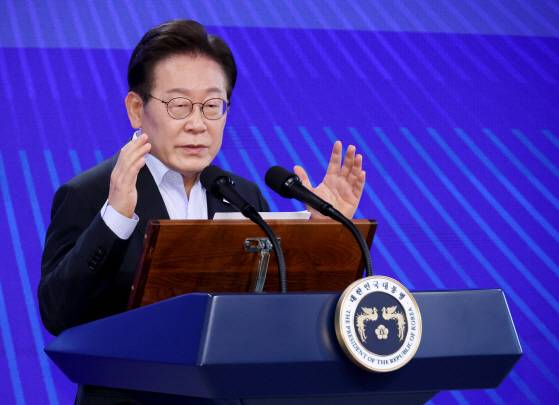 [이재명 대통령이 31일 정부서울청사에서 고위공직자들을 대상으로 특별 강연을 하고 있다. (사진=연합뉴스)]