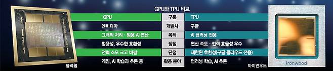 구글이 2016년 선보인 TPU는 이세돌 9단과 겨룬 바둑 대결에서 승리를 거머쥔 알파고에 적용됐던 AI 칩이다. '텐서(다차원 데이터)'라는 이름처럼 딥러닝에 필요한 복잡한 수학 계산(행렬 연산)을 GPU보다 잘 처리하도록 설계된 AI 전용 칩이다. GPU가 원래 게임 그래픽 처리용으로 개발된 뒤 AI 학습에 활용돼온 것이라면 TPU는 처음부터 AI 연산만을 위해 만든 맞춤형 칩이기 때문에 특정 작업에서 전력 소모가 낮고 속도가 빠르다는 장점이 있다.
