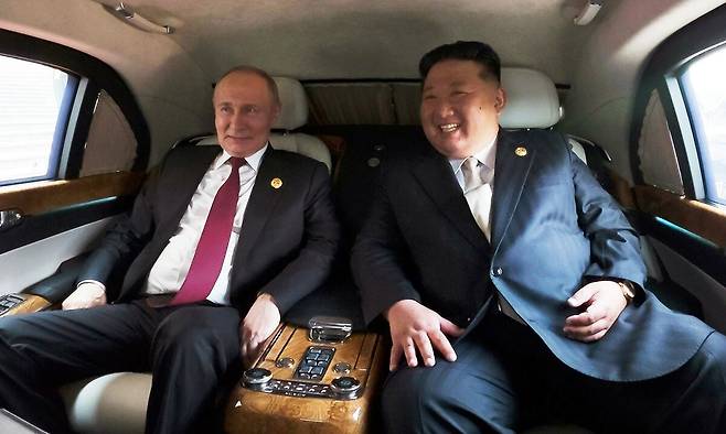 | 화기애애 3일 중국 베이징에서 만난 블라디미르 푸틴 러시아 대통령(왼쪽)과 김정은 북한 국무위원장이 푸틴 대통령의 아우루스 리무진에서 이야기를 나누고 있다. 베이징=노동신문·연합뉴스 |