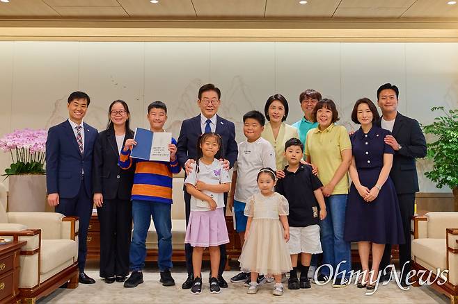 | ▲ 이재명 대통령이 4일 서울 용산 대통령실 청사에서 열린 어린이 초청 행사에 참석한 어린이 가족과 기념촬영을 하고 있다. |