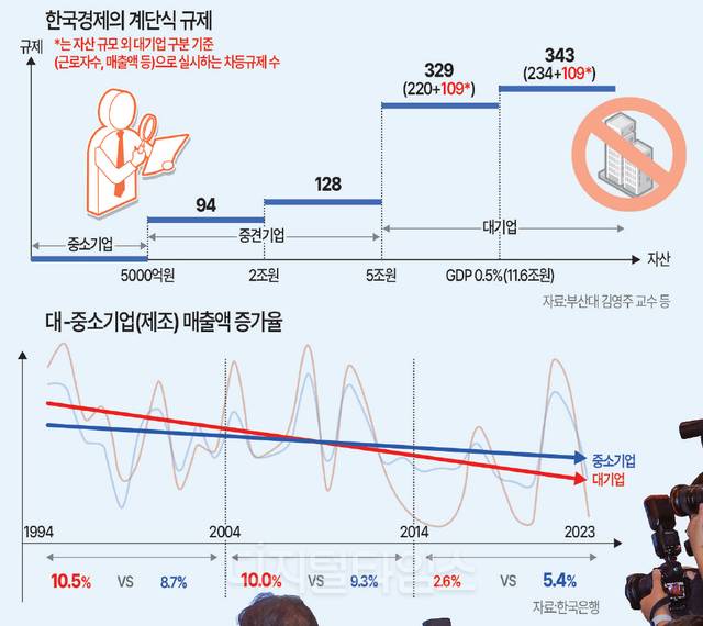 대한상의와 김영주 부산대 교수 연구팀이 이날 발표한 ‘차등규제 전수조사’ 결과를 보면 경제 관련 12개 법안에 343개의 기업별 차등 규제가 있고, 경제형벌 관련 조항은 6000개에 달하는 것으로 조사됐다.
